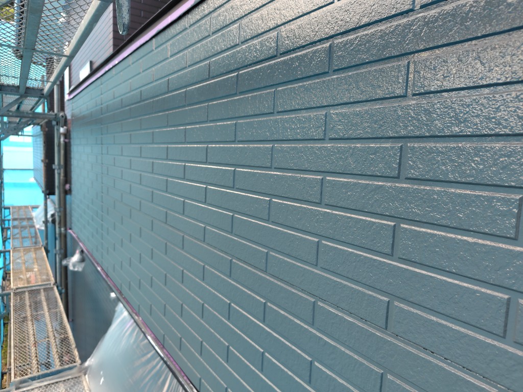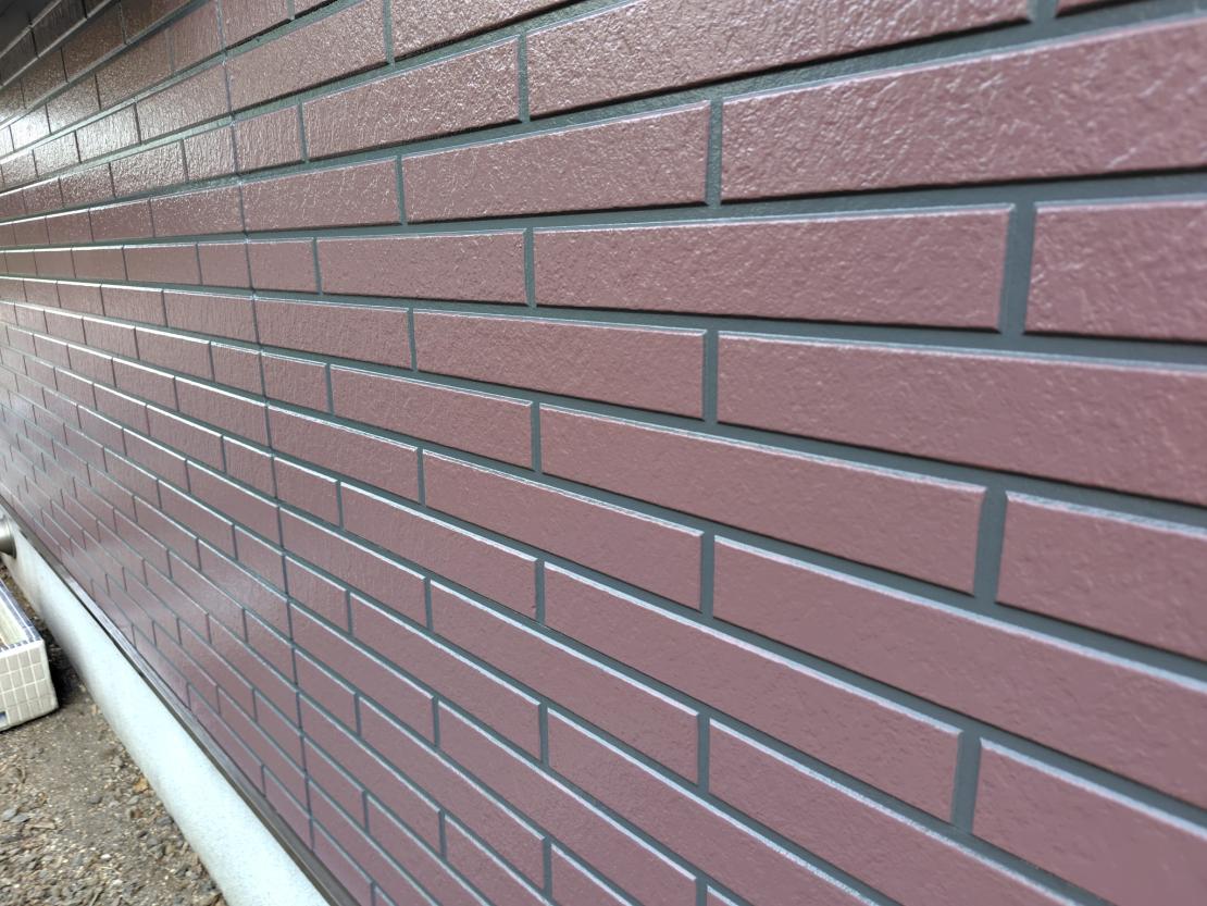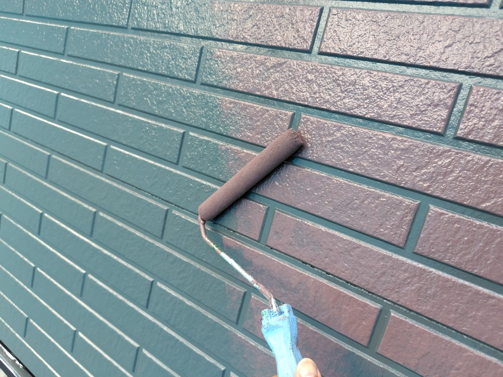 初めに目地の色でサイディング全体を仕上げていきます。その後、タイルの色で目地を塗りつぶさないように丁寧に塗っていくと2色になり、新築時のサイディングのように仕上がってきます。